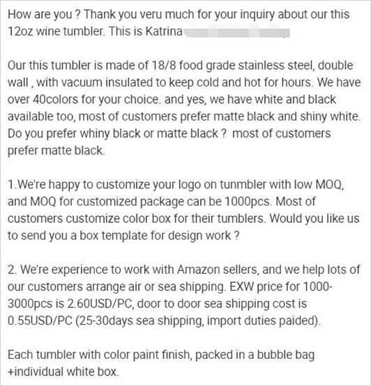 Talk about your product, shipping costs, packaging, and any others you can think of. Don’t worry about asking too much and then the supplier ignoring you. If they’re not responsive, just move on to another one. If a supplier isn’t willing to talk to you from the start, it means they don’t care about you. Don’t count on them getting better later.